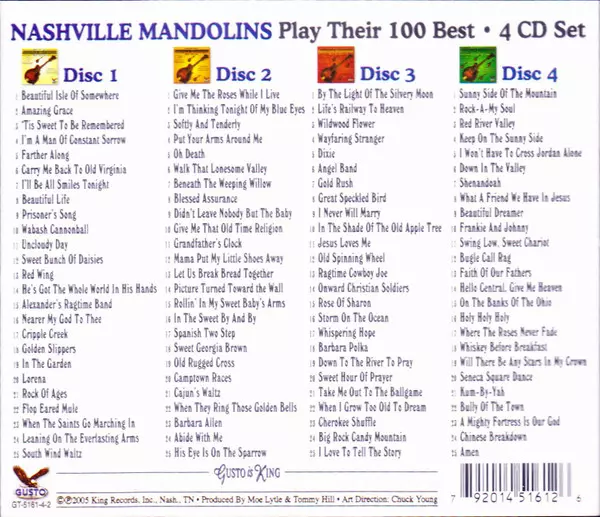 The Nashville Mandolins: Play Their 100 Best version on 4CD in Standard edition. This particular edition was published in USA in publishing company Gusto Records (2) on 15. February 2013. Album spans genres Folk, World, & Country, Country and Bluegrass.