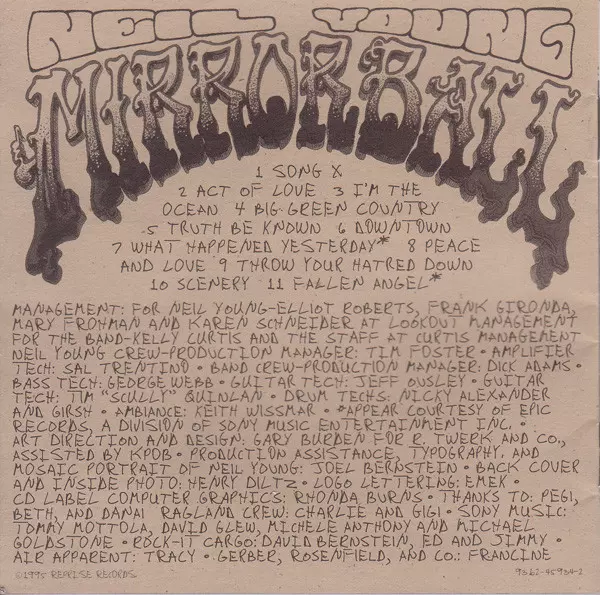 Mirror Ball is an album released in 1995 by Neil Young. The album was recorded with Crazy Horse and features the singles "Hey Hey, My My (Into the Black)" and "Peaceful Valley Boulevard". The album was commercially and critically successful, reaching number three on the Billboard 200 chart and earning a Grammy nomination for Best Rock Album.