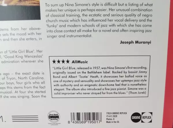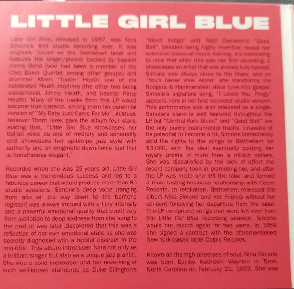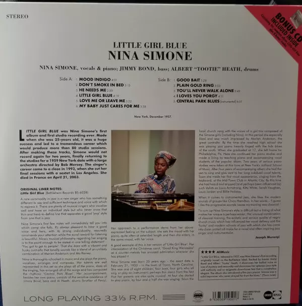 Little Girl Blue (also known as My Baby Just Cares for Me), here in stereo and a rare mono version, was Nina Simone's debut album and first ever studio recording. At the age of twenty-five, it was a huge success that led to a fabulous career that saw her make more than 80 studio recordings. It includes timeless classics such as "I Loves You Porg...