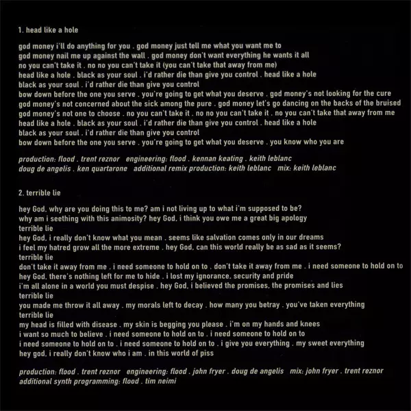 Engineer [Engineering] Doug DeAngelis, Flood, John Fryer | Mixed By [Mix] John Fryer, Trent Reznor | Producer [Production] Flood, Trent Reznor | Programmed By [Additional Synth Programming] Flood, Tim Niemi
