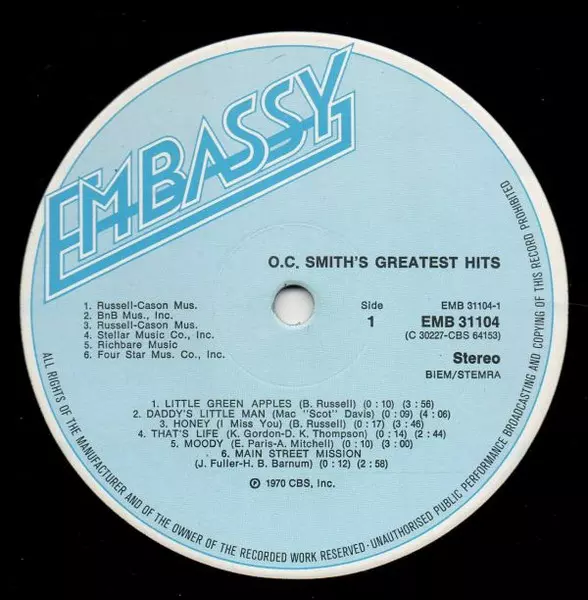 OC Smith: O.C. Smith's Greatest Hits version on vinyl LP in Standard edition. This particular edition was published in Europe in publishing company Embassy. Album spans genres Pop and Funk / Soul.