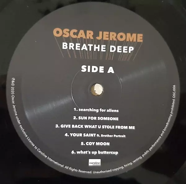 Oscar Jerome: Breathe Deep version on vinyl LP in Standard edition. This particular edition was published in United Kingdom in publishing company Caroline International on 14. August 2020. Album spans genres Jazz, Funk / Soul, Contemporary Jazz and Soul-Jazz.
