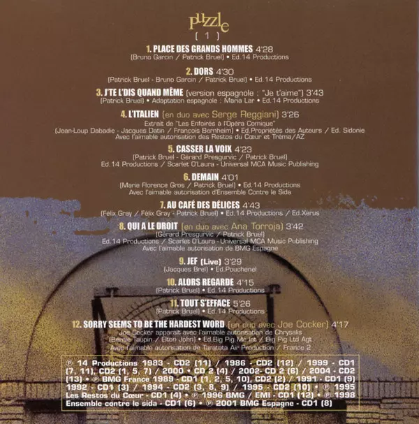Patrick Bruel: Puzzle version on 2CD in Standard edition. This particular edition was published in France in publishing company RCA year 2008. Album spans genres Pop and Chanson.