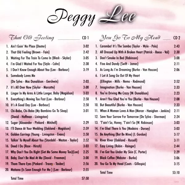 Peggy Lee: That Old Feeling - You Go To My Head version on 2CD in Standard edition. This particular edition was published in Germany in publishing company Past Perfect Jazz Line on 10. December 2018. Album spans genres Pop, Jazz, Vocal and Big Band.