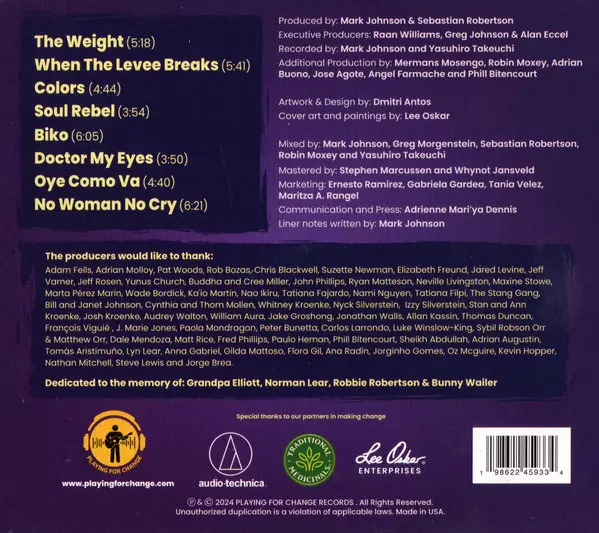 Accordion Chango Spasiuk | Bass James Hutchinson | Congas Sanjay Shrestha (2) | Drums Ringo Starr | Electric Guitar Char | Guitar Ali Boulala, Roberto Luti (2) | Oud أحمد الهرمي | Piano Keiko Komaki | Shaker Sol Homar | Sitar Ranjeev Shrestha | Ukulele Taimane | Vocals Mermans Mosengo, Roselyn Williams, Sherieta Lewis | Vocals, Guitar John Cruz (2), Larkin Poe, Lukas Nelson, Marcus King (2), Robin Moxey | Written-By, Vocals, Guitar Robbie Robertson