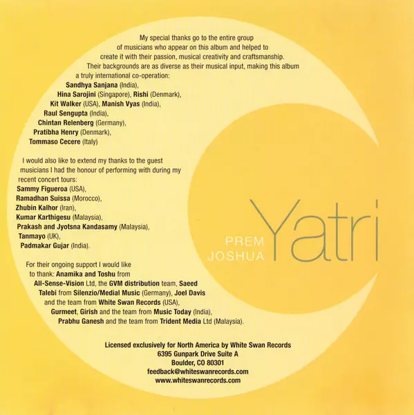 Prem Joshua: Yatri (Mystics Of Sound) version on CD in Standard edition. This particular edition was published in USA in publishing company White Swan Records on 1. May 2006. Album spans genres Folk, World, & Country and Indian Classical.