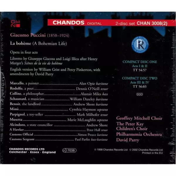 | Artist | Giacomo Puccini | Philharmonia Orchestra | David Parry | Alan Opie | Marie McLaughlin | Dennis O'neill | Cynthia Haymon |