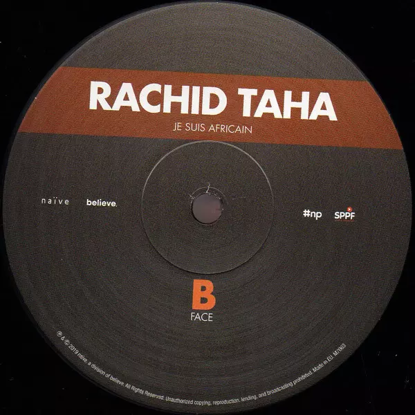 Rachid Taha: Je Suis Africain version on vinyl LP in Standard edition. This particular edition was published in France in publishing company Naïve in cooperation with #np on 18. October 2019. Album spans genres Rock, Folk, World, & Country, Reggae, Pop Rock, Folk Rock and Raï. Black Vinyl.