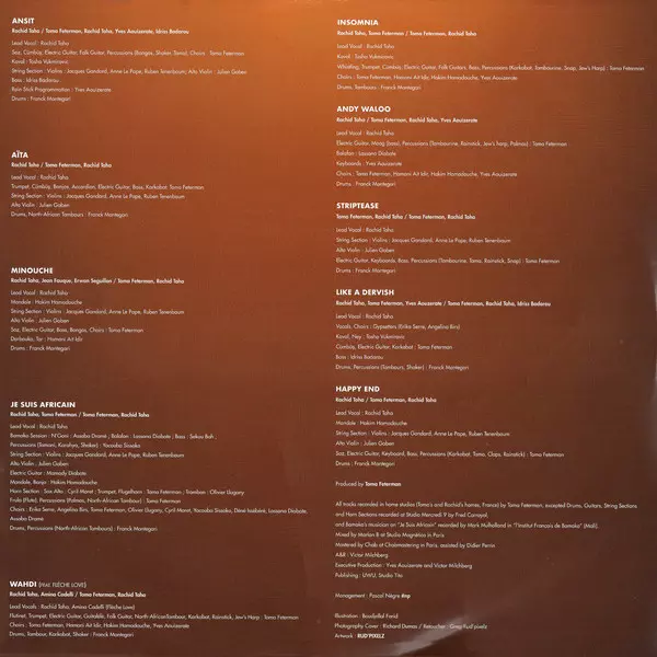 Backing Vocals Hakim Hamadouche, Hamani Ait Idir, Thomas Feterman, Yves Aouizerate | Balafon Lassana Diabaté | Drums Franck Mantegari | Electric Guitar, Bass [Moog], Tambourine, Rainstick, Jew's Harp, Percussion [Palmas] Thomas Feterman | Written-By, Keyboards Yves Aouizerate