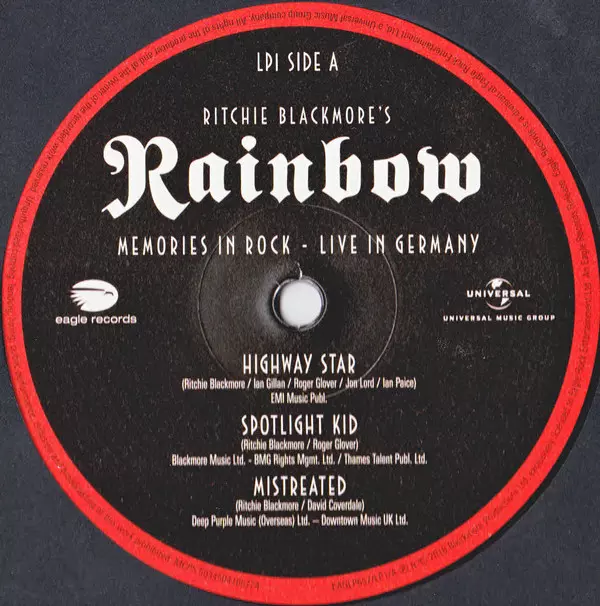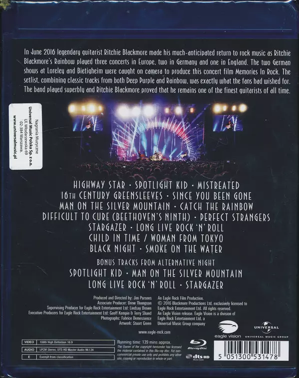 The new incarnation of Rainbow live in Germany In June 2016, Ritchie Blackmore's Rainbow performed three concerts in Europe: one in England and two in Germany, at Freilichtbühne Loreley and Bietigheim as part of the renewed Monsters Of Rock festival. "Memories In Rock - Live In Germany 2016" is the title of the new live best-of, which documents ...