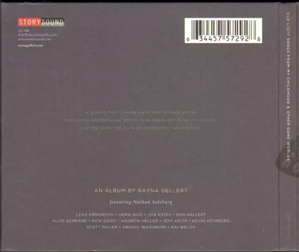 Rayna Gellert: Old Light: Songs From My Childhood And Other Gone Worlds version on CD in Standard edition. This particular edition was published in USA in publishing company StorySound Records on 15. July 2013. Album can be classified in the genre Folk, World, & Country.