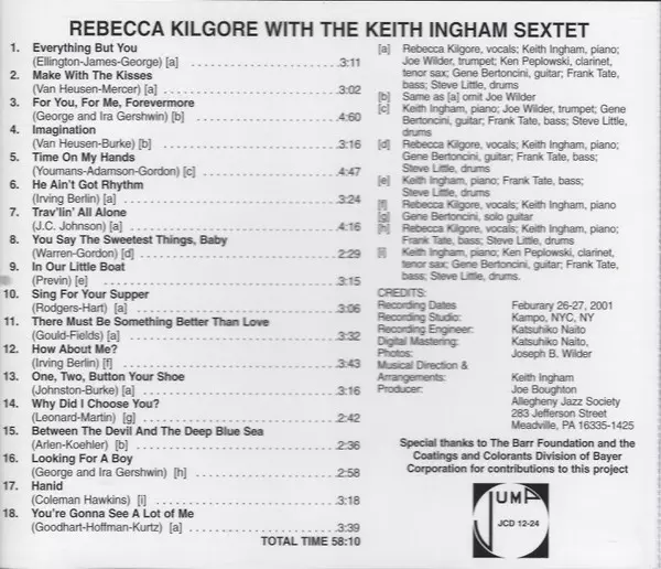 | Artist | The Keith Ingham Sextet | Rebecca Kilgore |