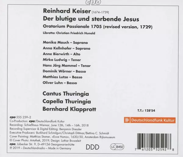 Cantus Thuringia: Der Blutige Und Sterbende Jesus version on 2CD in Standard edition. This particular edition was published in Germany in publishing company cpo on 3. May 2019. Album spans genres Classical, Baroque and Oratorio. Oratorium Passionale 1705 & 1729.