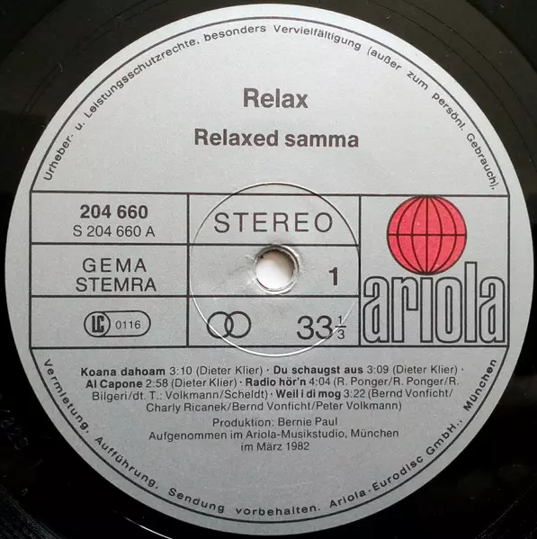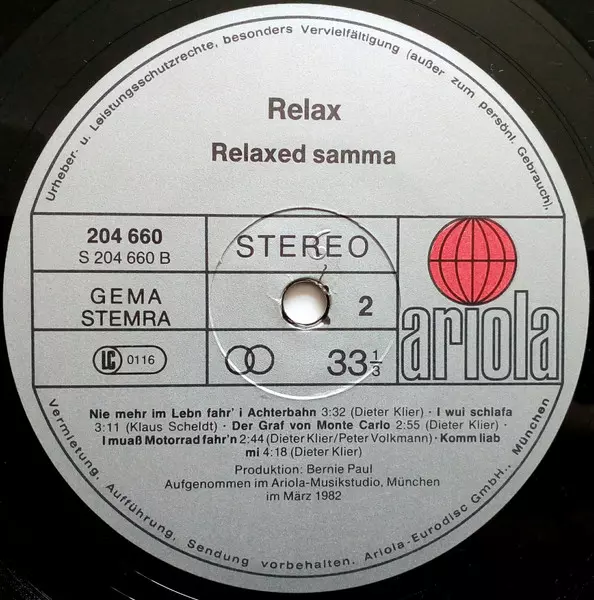 Relax: Relaxed Samma (Sind Wir) version on vinyl LP in Standard edition. This particular edition was published in Europe in publishing company Ariola year 1982. Album spans genres Rock and Pop.