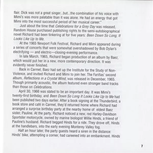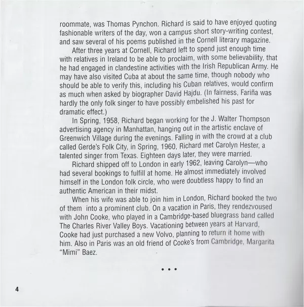 Bass Russ Savakus | Electric Guitar Bruce Langhorne | Piano Charlie Smalls | Vocals, Dulcimer Richard Farina | Vocals, Guitar Mimi Farina