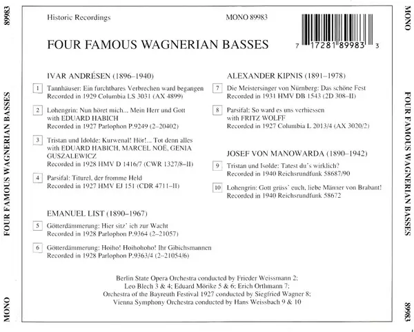 | Artist | Richard Wagner | Alexander Kipnis | Emanuel List | Josef von Manowarda | Ivar Andrésen |