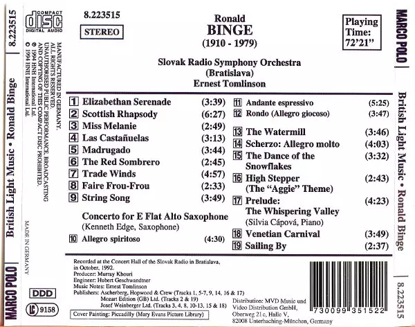 | Artist | Slovak Radio Symphony Orchestra | Ernest Tomlinson | Ronald Binge |
