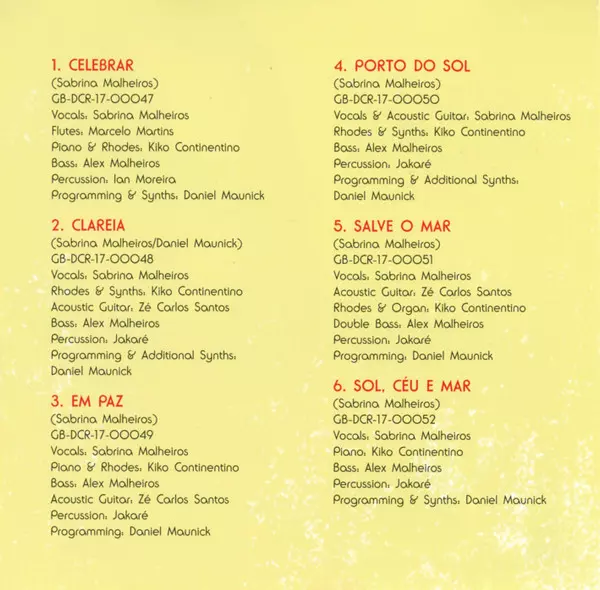 Acoustic Guitar Zé Carlos Santos | Bass Alex Malheiros | Electric Piano [Rhodes] Kiko Continentino | Percussion Jakaré Garcia | Programmed By [Programming] Daniel Maunick | Saxophone [Sax], Flute [Flutes] Leo Gandelman | Vocals Sabrina Malheiros | Written-By Sabrina Malheiros