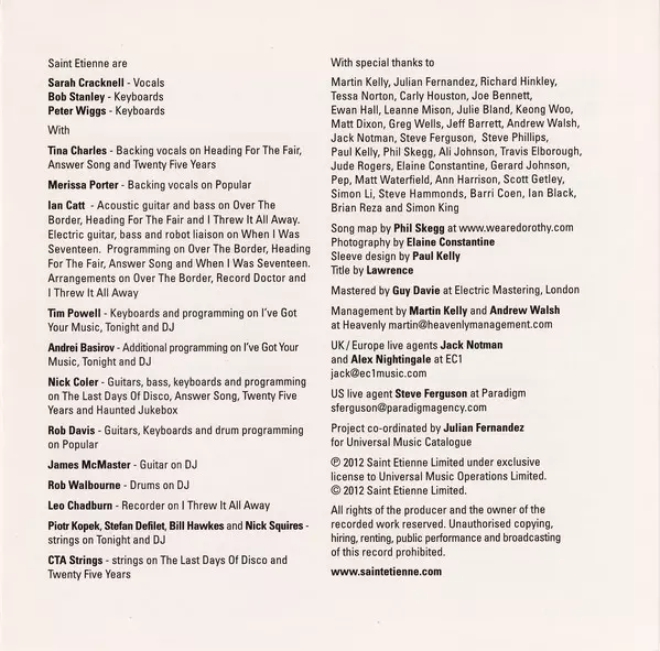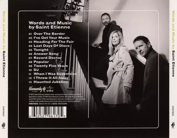 Saint Etienne: Words And Music By Saint Etienne version on CD in Standard edition. This particular edition was published in Europe and UK in publishing company Heavenly in cooperation with Universal UMC on 31. May 2012. Album spans genres Pop, Electronic, Indie Pop, Synth-pop, Nu-Disco and Electro House.