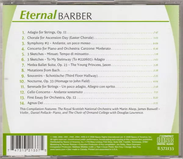 | Artist | Samuel Barber | Royal Scottish National Orchestra | Marin Alsop | James Buswell | Douglas Lawrence | Choir Of Ormond College | Daniel Pollack |