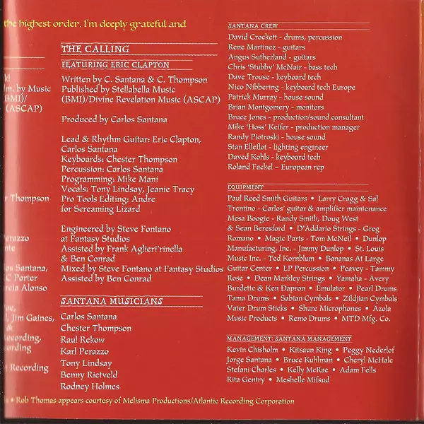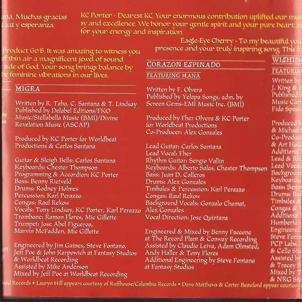 | Bass Benny Rietveld | Congas Paul Rekow | Drums Rodney Holmes | Engineer Jeff Poe, Jim Gaines, John Karpowich, Steve Fontano | Engineer [Assistant] Michael Anderson (3) | Keyboards Chester Thompson (2) | Mixed By Jeff Poe | Percussion, Vocals Karl Perazzo | Producer, Guitar, Bells [Sleigh] Carlos Santana | Producer, Programmed By, Accordion, Vocals KC Porter | Trombone Mic Gillette, Ramon Flores | Trumpet Jose Abel Figueroa, Marvin McFadden, Mic Gillette | Vocals Tony Lindsay | Written-By Carlos Santana, Rachid Taha, Tony Lindsay | |||