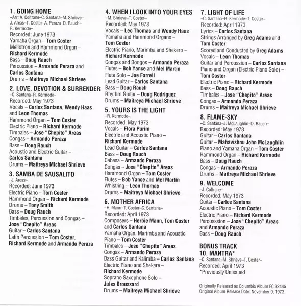 Arranged By Alice Coltrane, Armando Peraza, Carlos Santana, Doug Rauch, José "Chepito" Areas, Michael Shrieve, Richard Kermode, Tom Coster | Bass Doug Rauch | Drums Michael Shrieve | Organ [Hammond], Mellotron Richard Kermode | Organ [Yamaha] Tom Coster | Percussion Armando Peraza, Carlos Santana