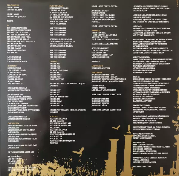Arranged By Seigmen | Arranged By [Strykearrangement] Baard Slagsvold | Engineer [Tekniker] Kai Ø. Andersen | Lyrics By [Tekst], Music By Lars Lillo-Stenberg | Producer Kai Ø. Andersen, Seigmen | Recorded By [Strykere] Kai Ø. Andersen, Tom Carlsen | Violin, Viola [Bratsj], Cello Strings Unlimited | |||