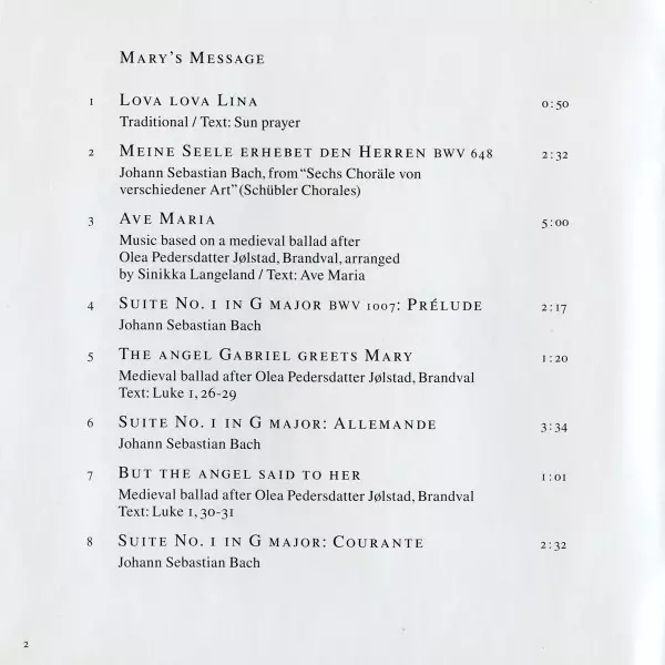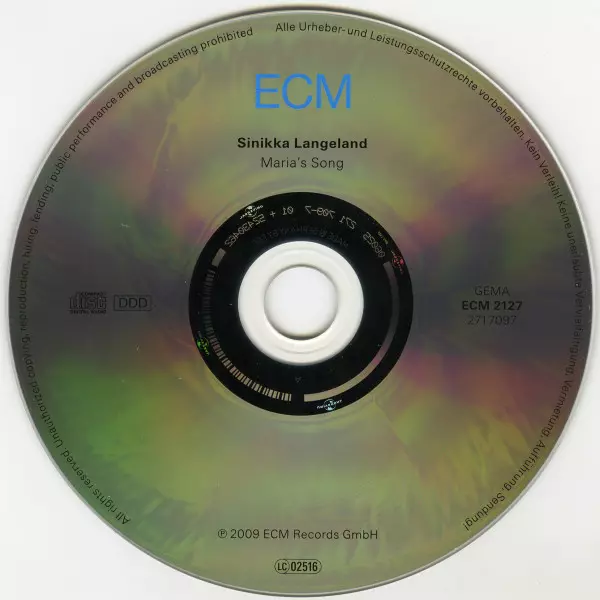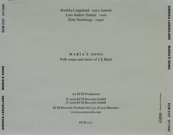 Sinikka Langeland: Maria's Song version on CD in Standard edition. This particular edition was published in Germany in publishing company ECM Records on 2. February 2011. Album spans genres Classical, Folk, World, & Country, Baroque and Nordic.