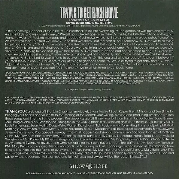 Acoustic Guitar Steven Curtis Chapman | Bass Brent Milligan | Cello Carole Rabinowitz, Paul Nelson (2) | Drums Will Chapman (2) | Electric Guitar Brent Milligan, Caleb Chapman (2) | Engineer Buckley Miller | Engineer [Assistant] Louis Remenapp | Mixed By Sean Moffitt | Piano, Synth, Arranged By [Strings Arrangement] Ben Shive | Producer Ben Shive, Brent Milligan, Caleb Chapman (2), Steven Curtis Chapman, Will Chapman (2) | Recorded By [Strings] Joe Carrell | Viola Elizabeth Lamb, Monisa Angell | Violin Alicia Enstrom, Alison Hoffman, Carolyn Bailey, David Angell, David Davidson, Karen Winkelmann | Written-By Ben Shive, Steven Curtis Chapman