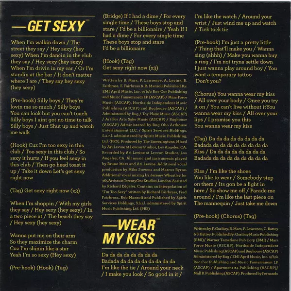 Mixed By [Additional Vocal Mixing By Assisted By] Richard Edgeler | Mixed By [Additional Vocal Mixing By] Jeremy Wheatley | Mixed By, Recorded By Ari Levine | Music By [All Music By], Instruments [All Instruments Played By] Ari Levine, Bruno Mars | Producer The Smeezingtons | Producer [Additional Vocal Production By] Marcus Byrne, Mike Stevens | Written-By Ari Levine, Bruno Mars, Fred Fairbrass, Phillip Lawrence, Richard Fairbrass, Rob Manzoli | Written-By [“I’m Too Sexy” Interpolation Written By] Fred Fairbrass, Richard Fairbrass, Rob Manzoli