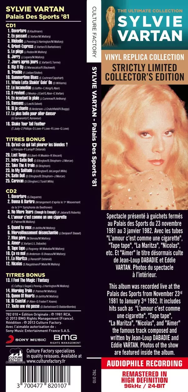 Sylvie Vartan: Palais Des Sports 81 LTD version on 2CD in limited Remastered edition. This particular edition was published in France in publishing company Culture Factory in cooperation with Sony Music and BMG Rights Management on 11. November 2013. Album spans genres Pop, Chanson and Music Hall. Vinyl Replica Limited Edition.