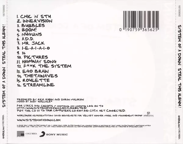 Steal This Album! by System of a Down is an explosive blend of heavy metal and punk rock. The album is full of political and social commentary, as well as the characteristic sound of heavy guitars and thunderous drums. The album was released in 2002 and was the band's third studio album. It was produced by Rick Rubin and recorded in the band's home studio. The album was a critical and commercial success and was nominated for a Grammy Award for Best Hard Rock Performance. The first single from the album, "Chop Suey!", became a huge hit and helped the album reach the top of the charts. The album is a must listen for all heavy metal and punk rock fans and showcases the band's incredible musical talent.