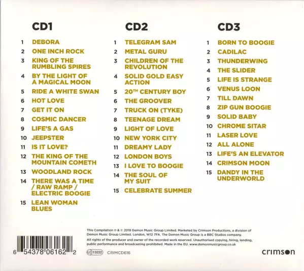 T. Rex - Gold obsahuje největší hity Marca Bolana a T. Rex na 3CD ve stylovém digipacku. Mezi 45 hity najdete klasické skladby jako Get It On, Metal Guru, Hot Love, Children Of The Revolution, Ride A White Swan, Telegram Sam, 20th Century Boy, Dandy In The Underworld a mnoho dalších.