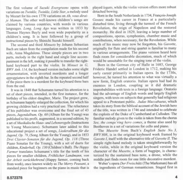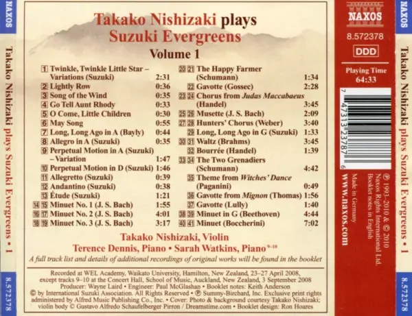 Takako Nishizaki: Takako Nishizaki Plays Suzuki Evergreens version on CD in Standard edition. This particular edition was published in USA in publishing company Naxos on 25. May 2010. Album spans genres Classical, Folk, World, & Country and Romantic.