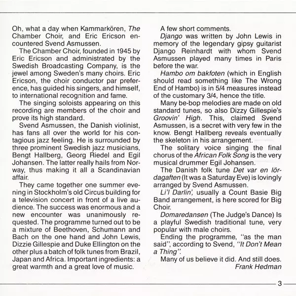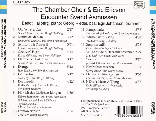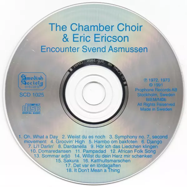 Eric Ericson: The Chamber Choir & Eric Ericson Encounter Svend Asmussen version on CD in Standard edition. This particular edition was published in Sweden in publishing company Swedish Society Discofil on 13. April 1991. Album spans genres Classical, Jazz and Choral.