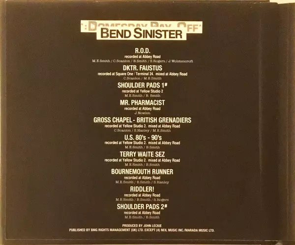 The Fall The 1986 album Bend Sinister is one of the band's most acclaimed albums. The album was produced by John Leckie, who also produced albums for Radiohead and The Stone Roses. The album's sound is characterized by jagged guitars, Mark E. Smith's distinctive vocals and a dark, atmospheric sound. Standout tracks on the album include "Hit the North", "The Joke" and "Victoria".