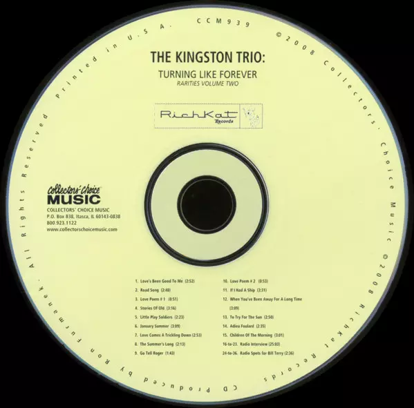 Kingston Trio: Turning Like Forever Rarities Volume Two version on CD in Standard edition. This particular edition was published in USA in publishing company Collectors' Choice Music in cooperation with RichKat Records on 3. June 2022. Album spans genres Rock, Pop and Pop Rock.