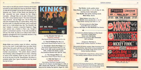 The Kinks : Kinda Kinks is a 1965 album released by The Kinks . It was their second album to be released in the UK on Pye Records. The album was produced by Shel Talmy. The album was recorded at Pye Studios in London, England. The album was released on CD in 1992 by Castle Communications. The album was re-released on CD in 2009 by Sanctuary Records. The album was re-released on vinyl in 2009 by Pye Records. The album was re-released on vinyl in 2016 by BMG.