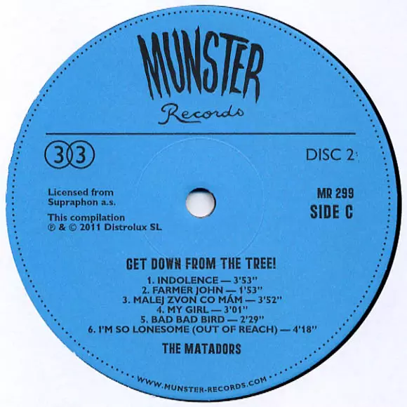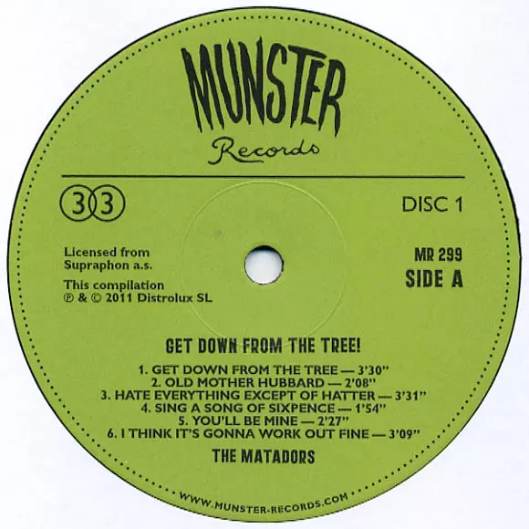 The Matadors: Get Down From The Tree! version on vinyl 2LP in Remastered edition. This particular edition was published in Spain in publishing company Munster Records on 1. March 2011. Album spans genres Rock, Beat, Rhythm & Blues, Psychedelic rock, Garage Rock, Rock & Roll and Czechoslovakian classics.