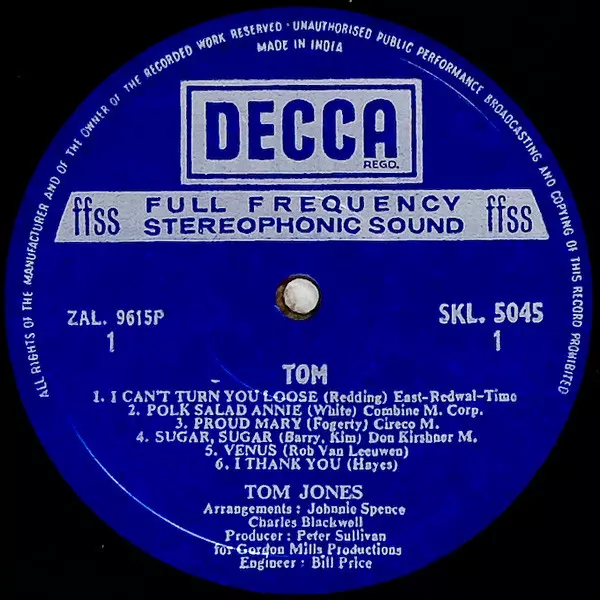 Tom Jones: Tom version on vinyl LP in Standard edition. This particular edition was published in India in publishing company Decca. Album spans genres Rock and Pop Rock.