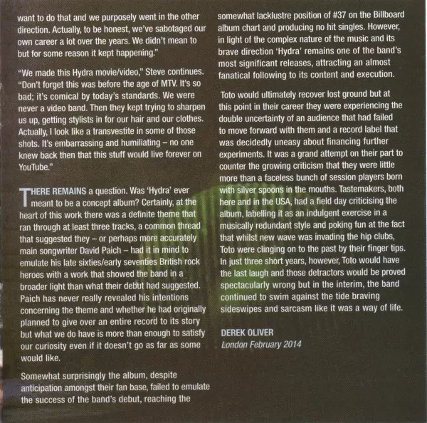 When Toto returned with their second album "Hydra", originally released in 1979, fans and critics alike were confronted with a body of work that, while instantly recognizable, was much more advanced and complex. Instead of serving up another serving of stylish pop-rock, they dug deep within themselves and devoted themselves to elaborate composit...