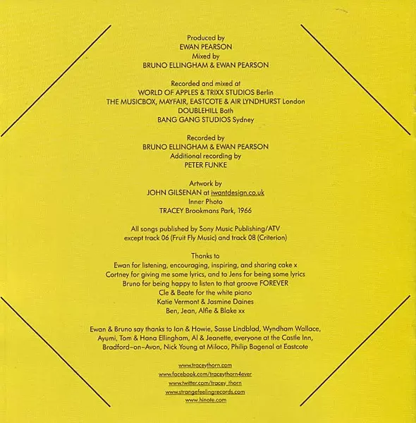 Arranged By [Recorder Arrangement] Kate St. John | Recorder Pamela Thorby | Sampler [Sampled Piano], Synthesizer [Yamaha Cs60, Korg Minipops 7, Electro-harmonix Drm16] Ewan Pearson | Vocals, Acoustic Guitar, Piano Tracey Thorn | Words By, Music By Tracey Thorn