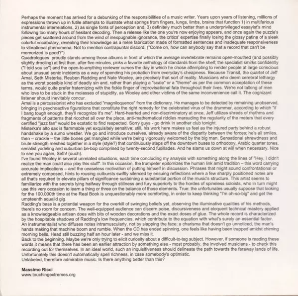 | Artist | Nate Wooley | Reuben Radding | Transit | Jeff Arnal | Seth Misterka |