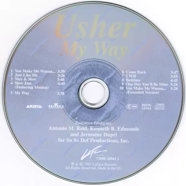 Usher: My Way version on CD in Standard edition. This particular edition was published in Europe in publishing company LaFace Records in cooperation with Arista and BMG on 28. July 2015. Album spans genres Funk / Soul and Contemporary R&B.