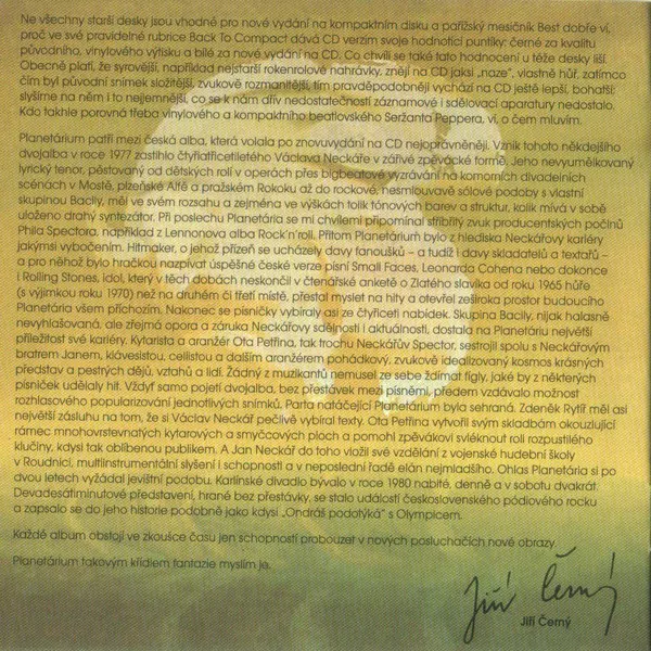 Václav Neckář The album Planetarium, released in 1977, is a must-listen for fans of Czech music. The album contains ten tracks and is a blend of folk and rock music that is sure to entertain from start to finish. Whether you are a fan of Czech music or not, you will definitely want to give this album a listen.