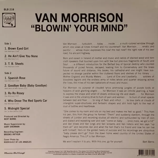 "Blowin' Your Mind", Van Morrison's first album, is widely regarded as a prelude to 1968's "Astral Weeks", which critics rightly hail as the Northern Irish bluesman's masterpiece. But the album "Blowin Your Mind" is a true masterpiece in its own right, featuring such epic tracks as the megahit "Brown Eyed Girl," the funky "Goodbye Baby (Baby Goo...