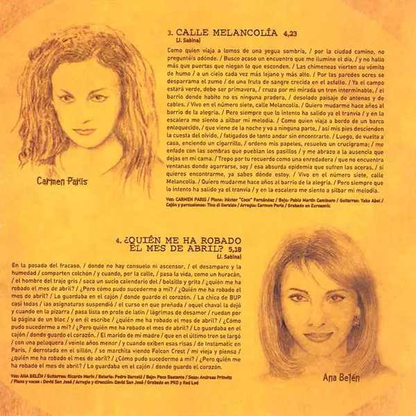 | Arranged By, Directed By [Arregos Y Dirección] David San José | Bass Javier Saiz | Cello Joaquim Alabau | Drums Angel Crespo | Piano David San José | Violin, Viola Pere Bardagí | Vocals Sole Giménez | Written-By Joaquín Sabina, Josep Maria Bardagí | |||