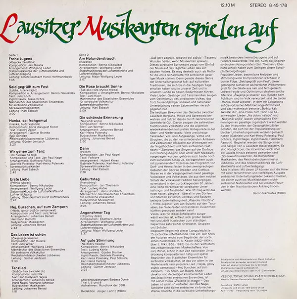A2 | Ingrid Raack, Klaus Britze, Chor Des Staatlichen Ensembles Für Sorbische Volkskultur Bautzen, Spreewaldmusikanten: Seid Gegrüßt Zum Fest =Lubše, Luźe Witajšo | 3:00 min | |