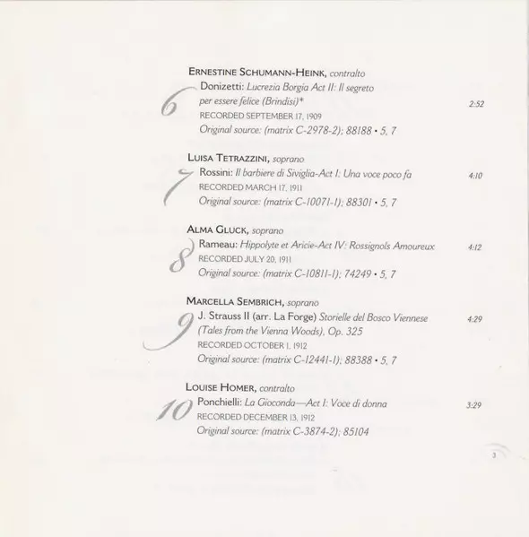 | 1-6 | Ernestine Schumann-Heink: Lucrezia Borgia-Act II: Il Segreto Per Essere Felice (Brindisi) | 2:52 min | |