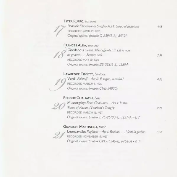 | 1-21 | Giovanni Martinelli: Pagliacci-Act I: Recitar!... Vesti La Giubba | 3:57 min | |